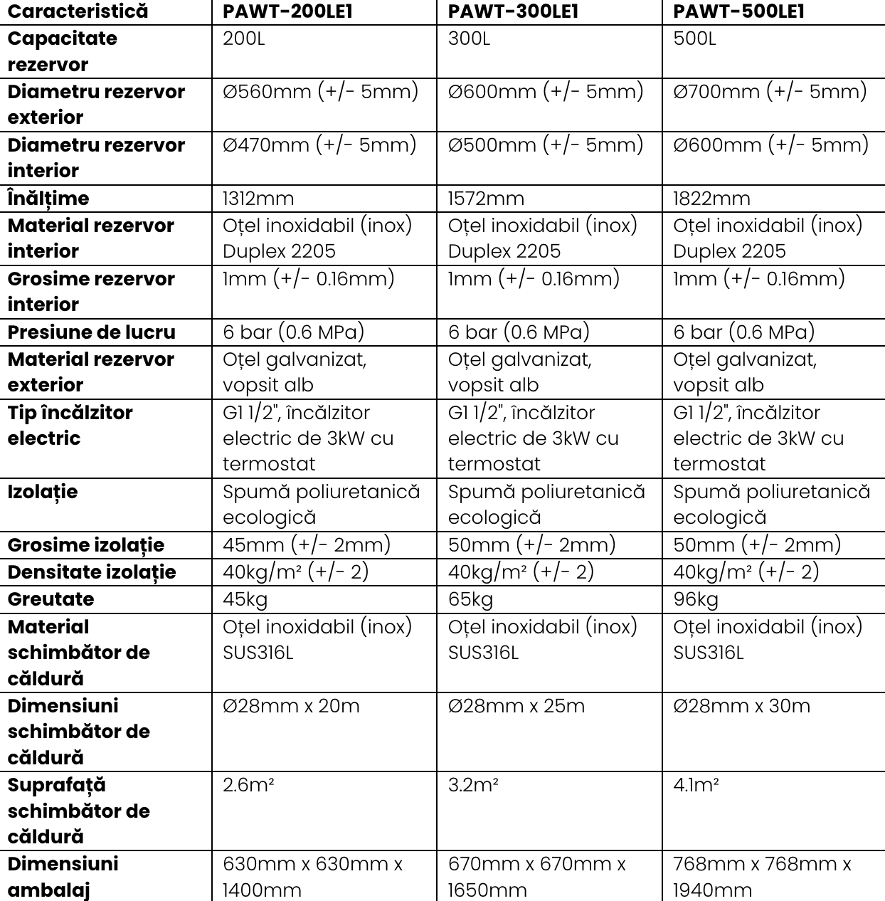 | Alte avantaje | Protecție catodică cu anod de magneziu, design robust, compatibilitate ridicată cu pompe de căldură |